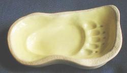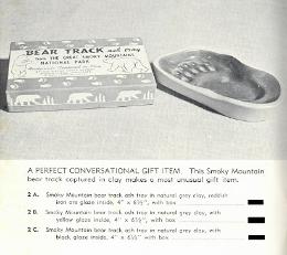 | The Bear Paw print came from the visitor center at the entrance to the Great Smokey Mountain National Park. Douglas Ferguson made the mold from the paw of a baby black bear that was on display there in the visitor center. The item originally came in a box and was available in several glazes including: Redish Iron Ore Yellow Black Later on, the item was also available in a beautiful blue glaze. THE PIGEON FORGE POTTERY PIGEON FORGE, TENNESSEE |