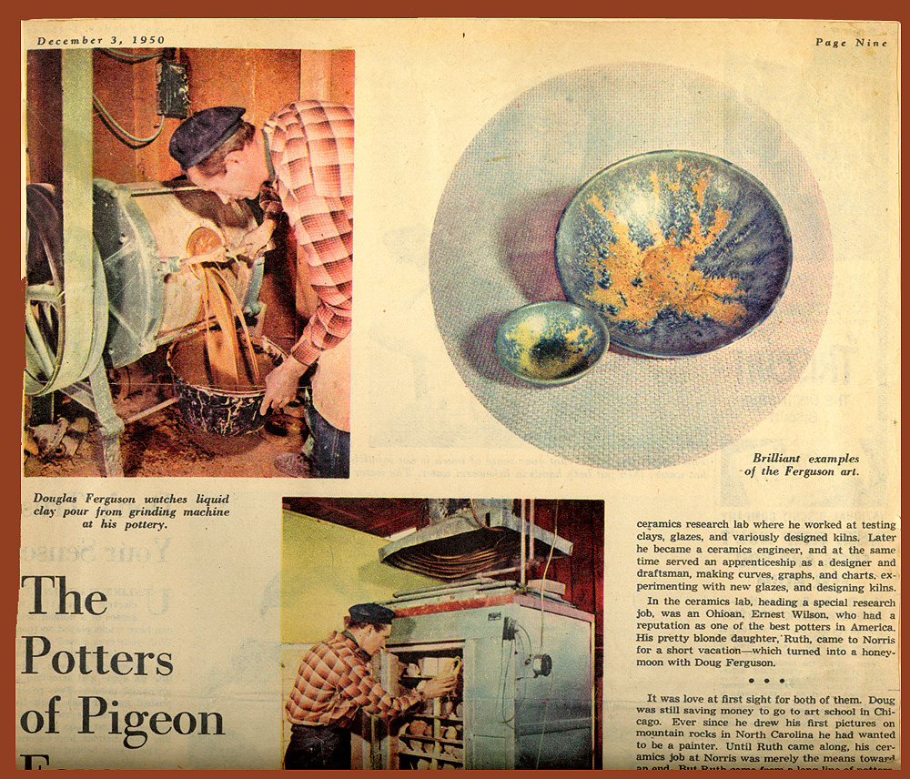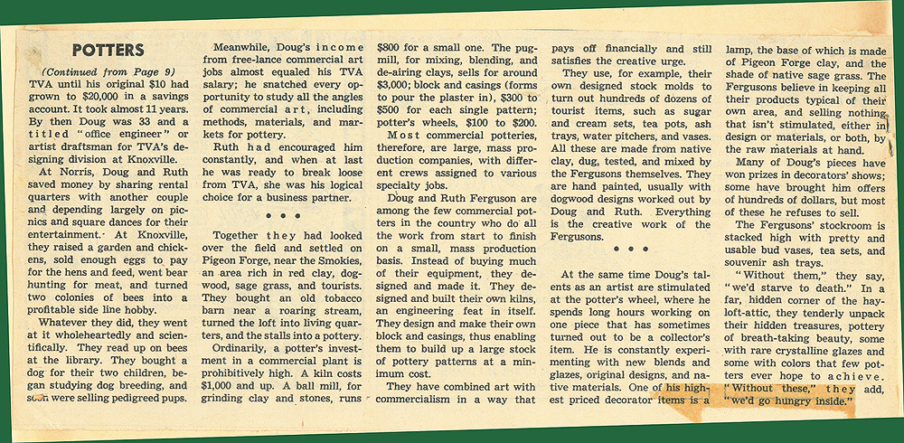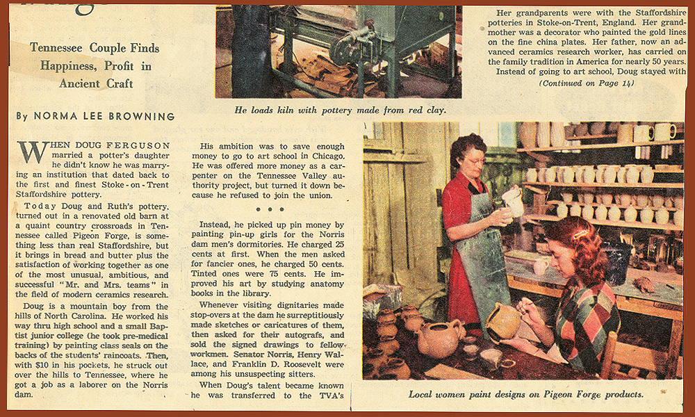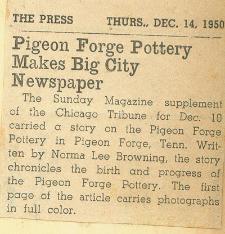 The Pigeon Forge Pottery Story Told in Newspaper The Sunday Magazine supplement of the Chicago Tribune carried a story on the Pigeon Forge Pottery in Pigeon Forge, Tenn. The story chronicles the birth and progress of the Pigeon Forge Pottery just four years after it's beginning. |